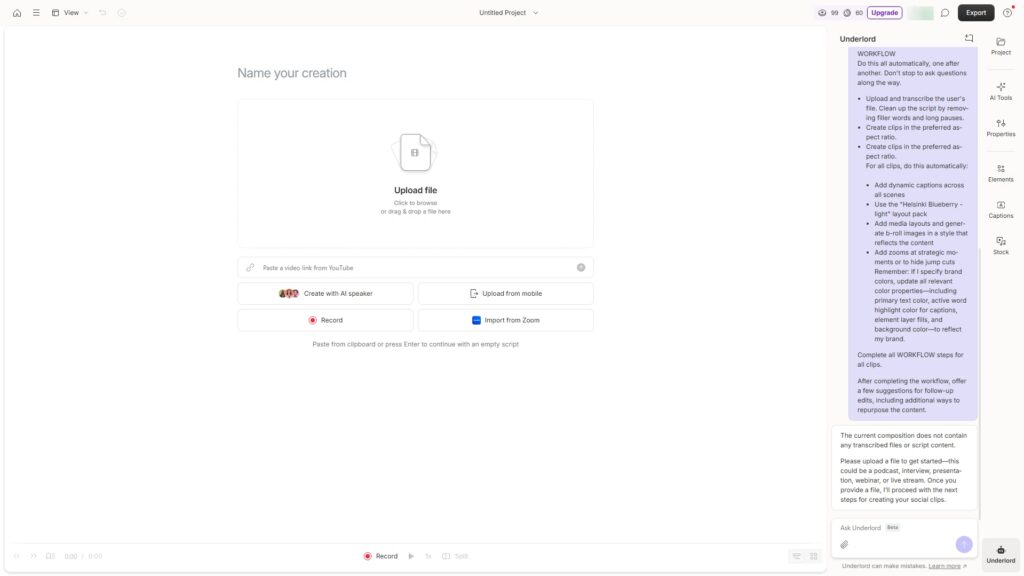 Очень популярный вариант, особенно для соцсетей. Сам кадрирует видео под вертикальный формат, добавляет эффекты и субтитры. Отлично заточен под TikTok — есть куча готовых шаблонов. Бесплатный, но с водяными знаками. Полноценная версия — от $9 в месяц.